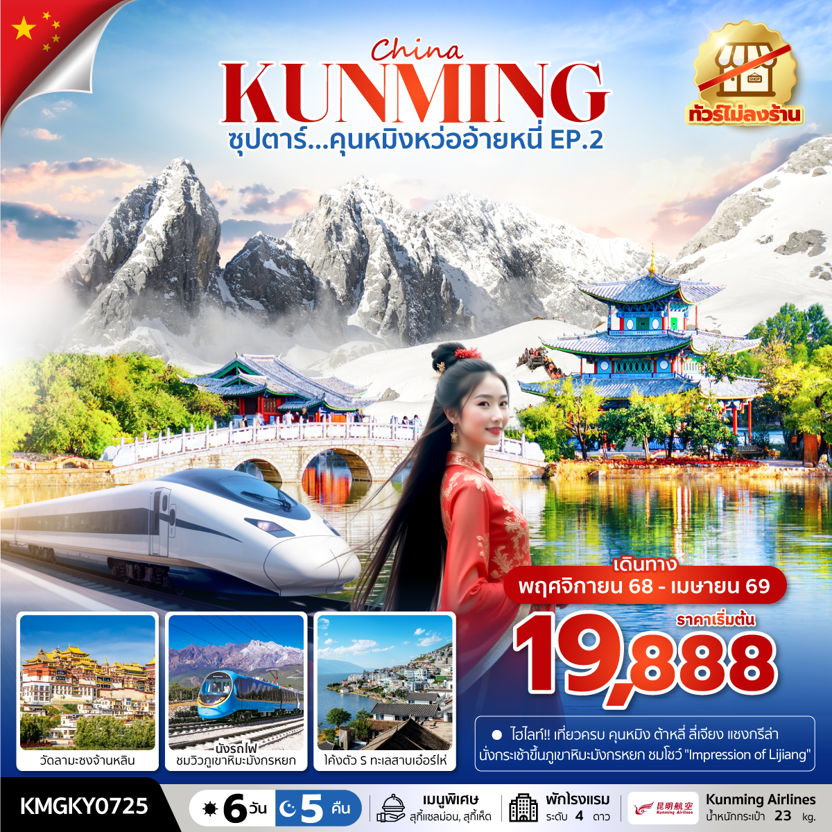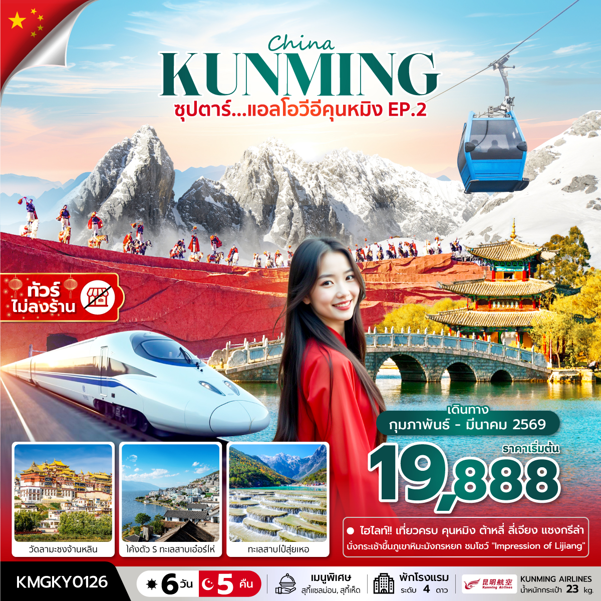 คุนหมิง ต้าลี่ ลี่เจียง แชงกรีล่า ภูเขาหิมะมังกรหยก นครคุนหมิง เมืองต้าหลี่ หมู่บ้านซีโจว วัดเจ้าแม่กวนอิมแปลงกาย เจดีย์ 3 องค์ เมืองจงเตี้ยน “แชงกรีล่า” โค้งแรกแม่น้ำแยงซีเกียง เมืองโบราณแชงกรีล่า หุบเขาพระจันทร์สีน้ำเงิน วัดลามะซงจ้านหลิน เมืองโบราณลี่เจียง เขาหิมะมังกรหยก ชม IMPRESSION LIJIANG อุทยานน้ำหยก สวนสาธารณะเหยหลงถาน เมืองต้าหลี่ เมืองคุนหมิง ตำหนักทองจินเตี้ยน ดหยวนทง