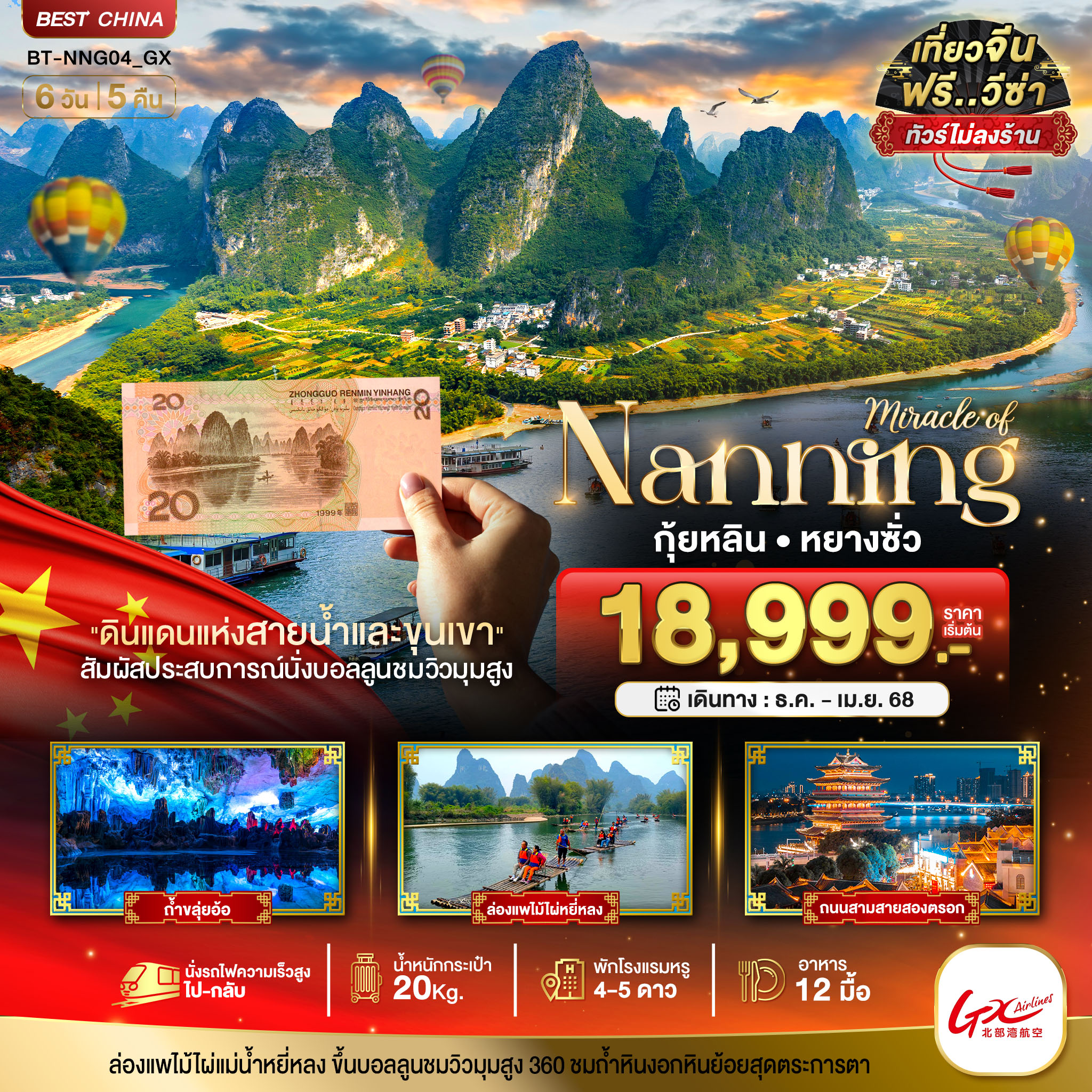 สถานีรถไฟความเร็วสูงหนานหนิง เมืองกุ้ยหลิน ถ้าขลุ่ยอ้อ เขางวงช้าง เจดีย์เงิน เจดีย์ทอง โชว์Mirage Guilin Night Show เมืองหยางซ่ัว ล่องแพไม้ไผ่แม่น้าหยู่หลง ผ่านชมเขาวงพระจันทร์ ถนนฝร่ังซีเจีย น่ังกระเช้าสู่ยอดเขาหลยู่ ี่ จุดชมวิวภูเขาหลู่ยี่ฟง น่ังบอลลูนชมวิว 360 องศา