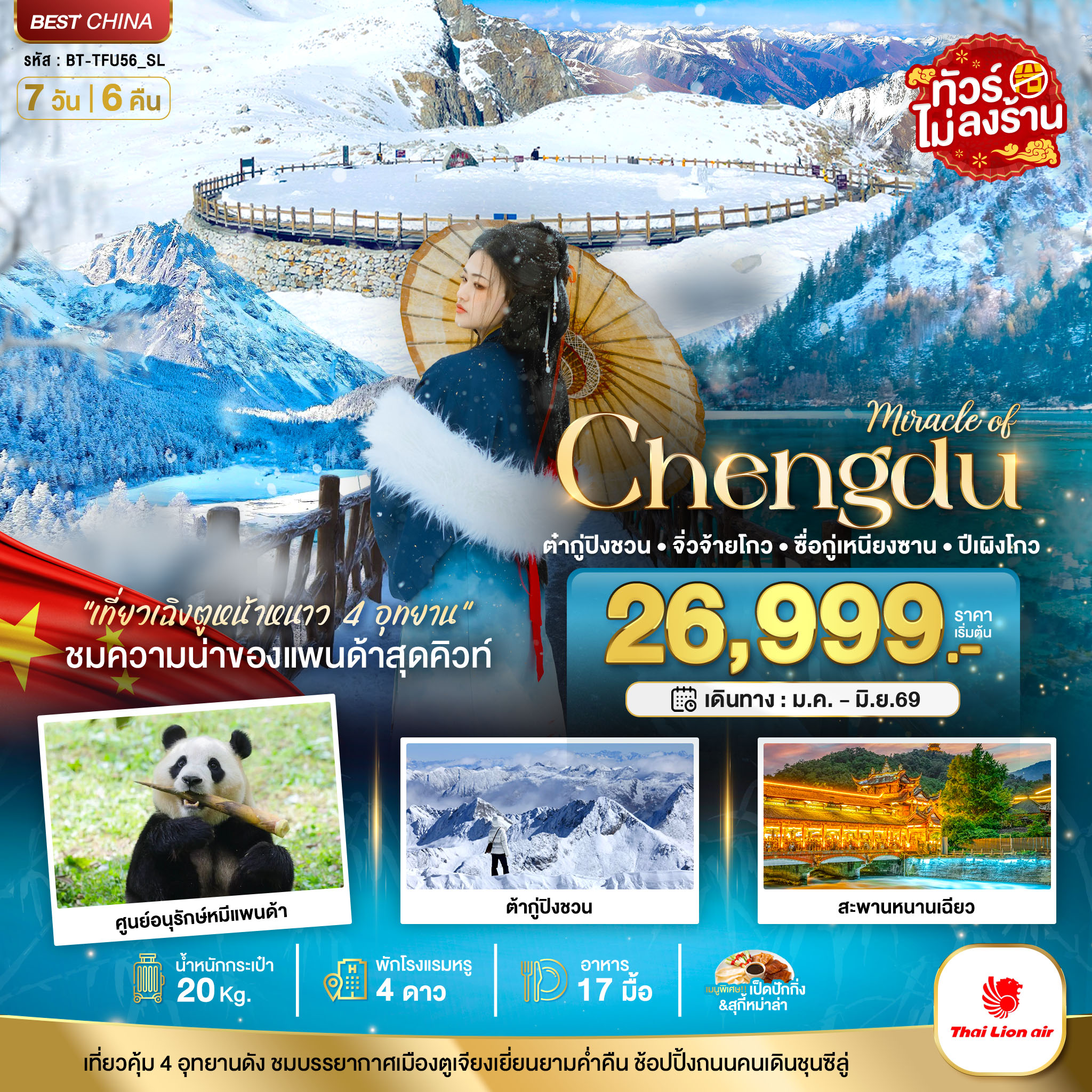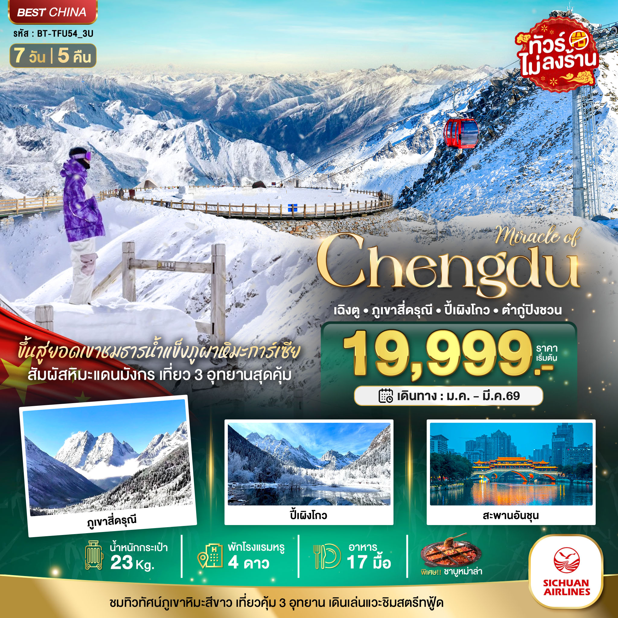 BT-TFU48_VZ มหัศจรรย์...เฉิงตู จิ่วจ้ายโกว ภูเขาสี่ดรุณี (ไม่ลงร้าน-นั่งรถไฟความเร็วสูง) 5 วัน 4 คืน