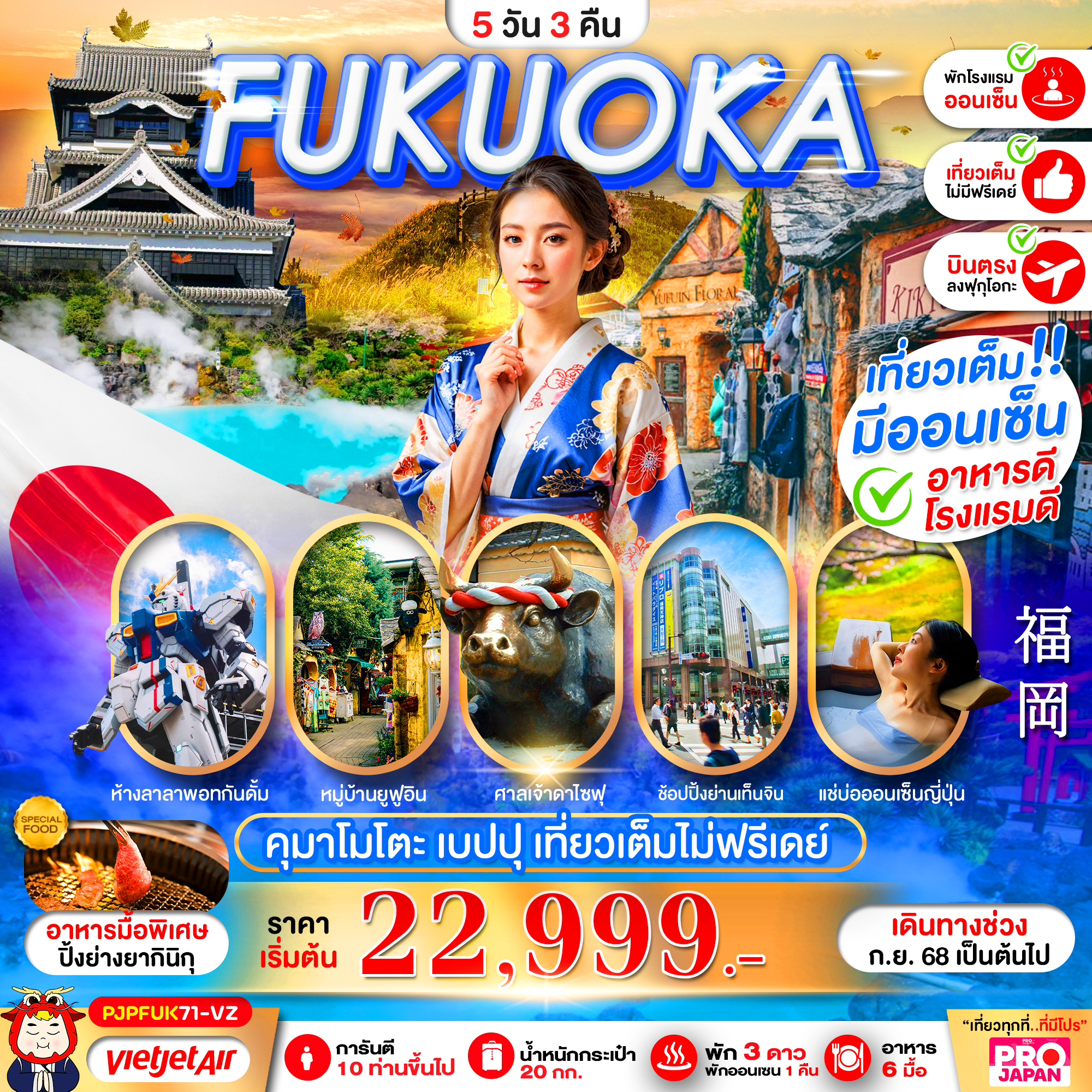 เมืองฟุกุโอกะ • ศาลเจ้าดาไซฟุ • สวนดอกวิสทีเรียYanagawa • ช้อปป้ิงชิโมโทร เมืองคุมาโมโต้• ปราสาทคุมาโมโต้• ทุ่งหญ้าคุสะเซนริ• บ่อยูมิจิโกก หมู่บ้านยูฟุอินฟลอร์รัล • ทะเลสาบคินริน • DUTY FREE • ช้อปป้ิงย่านเทนจิน